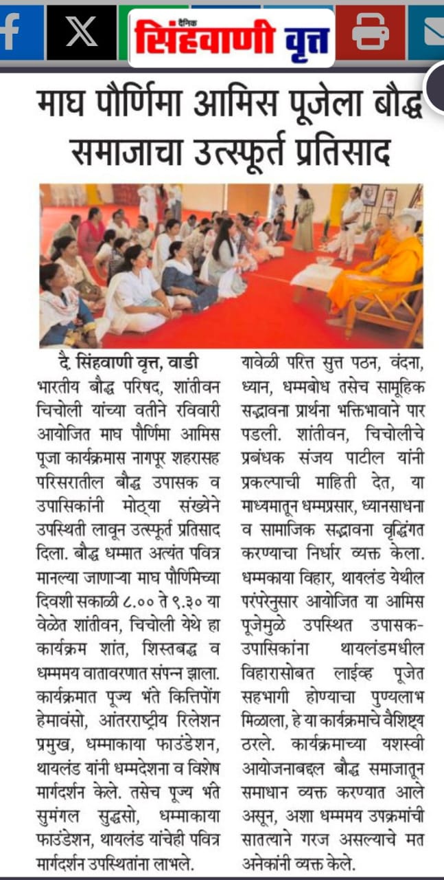 दै. सिंहवाणी वृत्त, वाडी भारतीय बौद्ध परिषद, शांतीवन चिचोली यांच्या वतीने रविवारी आयोजित माघ पौर्णिमा आमिस पूजा कार्यक्रमास नागपूर शहरासह परिसरातील बौद्ध उपासक व उपासिकांनी मोठ्या संख्येने उपस्थिती लावून उत्स्फूर्त प्रतिसाद दिला. बौद्ध धम्मात अत्यंत पवित्र मानल्या जाणाऱ्या माघ पौर्णिमेच्या दिवशी सकाळी ८.०० ते ९.३० या वेळेत शांतीवन, चिचोली येथे हा कार्यक्रम शांत, शिस्तबद्ध व धम्ममय वातावरणात संपन्न झाला. कार्यक्रमात पूज्य भंते कित्तिपोंग हेमावंसो, आंतरराष्ट्रीय रिलेशन प्रमुख, धम्माकाया फाउंडेशन, थायलंड यांनी धम्मदेशना व विशेष मार्गदर्शन केले. तसेच पूज्य भते सुमंगल सुद्धसो, धम्माकाया फाउंडेशन, थायलंड यांचेही पवित्र मार्गदर्शन उपस्थितांना लाभले.